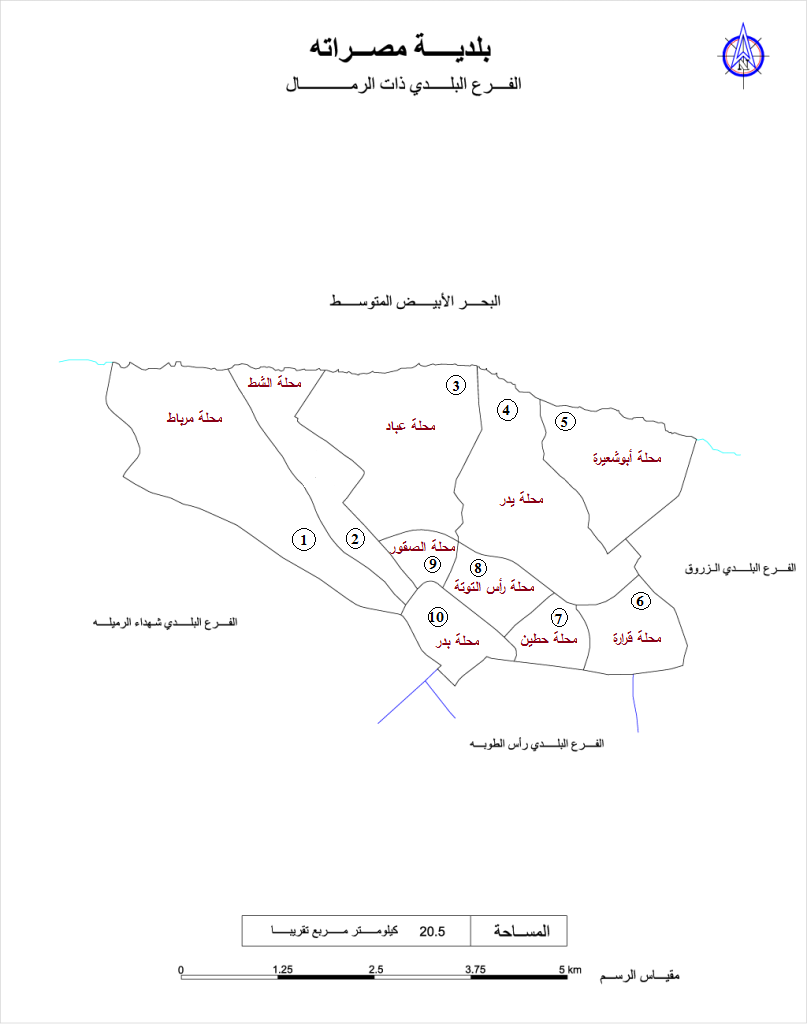 جنوبا: الفرع البلدي شهداء رأس الطوبه – الفرع البلدي مصراتة المركز – الفرع البلدي شهداء الرميله